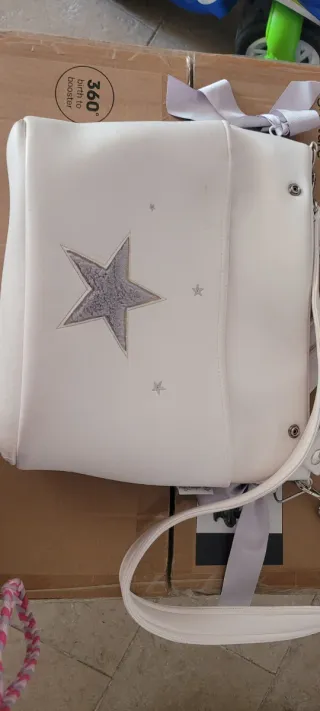 Bolso talega de la marca Rosy Fuentes con un diseño de estrellas. - Color blanco y gris. - Adorno de estrellas bordadas. Está manchado con algún caramelo Por dentro de ahí su precio Nuevo vale 75 euros Está usado en contadas ocasiones