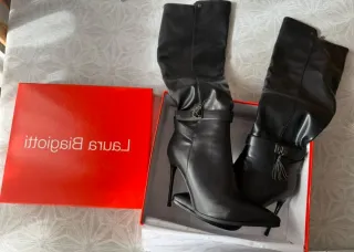 Botas altas de la marca Laura Biagiotti. - Diseño elegante con tacón de aguja. - Acabado en piel. - Detalle de correa con adorno metálico.
