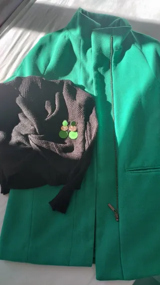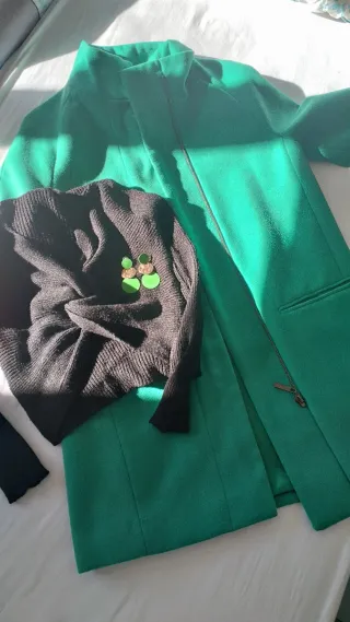 Conjunto de abrigo verde y jersey negro. - Abrigo largo con cremallera. - Jersey de punto fino. - Adorno de broche con círculos verdes y dorados.