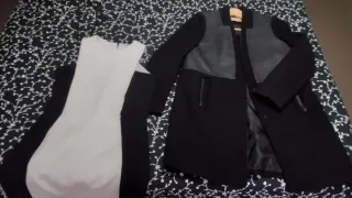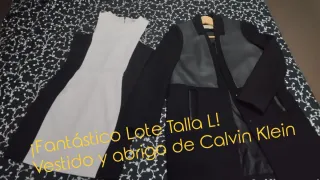 Lote de vestido y abrigo de la marca Calvin Klein. - Vestido de corte recto con detalles en contraste. - Abrigo largo con solapas y detalles en piel.