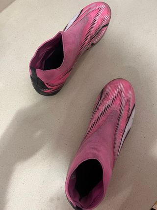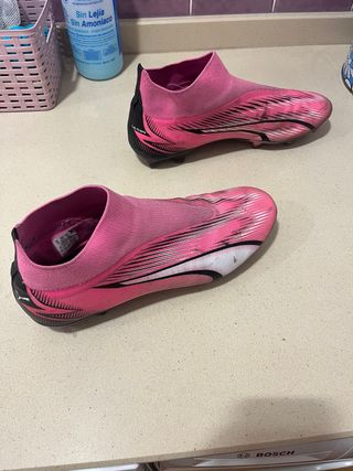 Botas de fútbol Puma Ultra en llamativo color rosa con detalles en negro y blanco. Diseñadas para la velocidad y el rendimiento en el campo. - Modelo: Ultra 1.3 o 1.4 - Colección: Unite Pack o Speed Pack - Diseño sin cordones para un ajuste ceñido - Parte superior textil para mayor ligereza