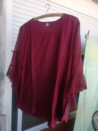 Camisa elegante de color burdeos, con un diseño moderno y detalles en las mangas. - Tejido ligero y con textura. - Mangas acampanadas con volantes. - Cuello redondo.