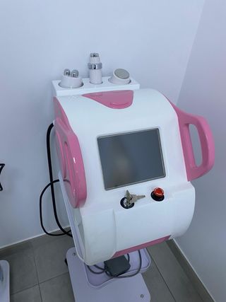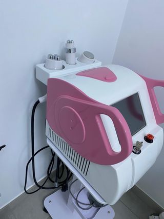 Equipo de radiofrecuencia para tratamientos estéticos. Diseñado con una combinación de colores rosa y blanco. - Incluye cavitación, radiofrecuencia bipolar y tripolar. Además también tiene vacum y cabezal para radiofrecuencia corporal. - Panel de control con pantalla. - Llave de seguridad.