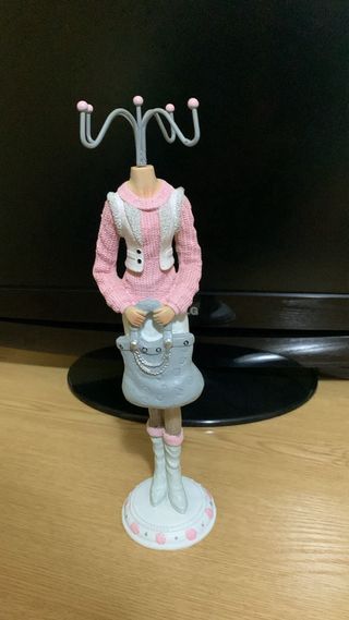 Original colgador de collares con forma de figura femenina. - Diseño con suéter tejido rosa y chaleco blanco. - Incluye bolso gris con detalles. - Base decorativa con motivos florales.