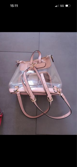Bolso de espalda con un diseño moderno y práctico. - Material principal transparente. - Detalles y asas en color rosa y beige.