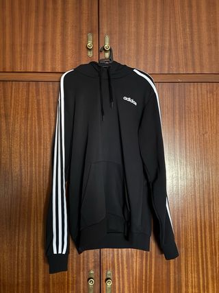 Sudadera con capucha de Adidas en color negro. Presenta el icónico diseño de tres rayas blancas en las mangas. - Diseño con capucha y cordones ajustables. - Bolsillo tipo canguro en la parte frontal. - Puños y bajo elásticos.