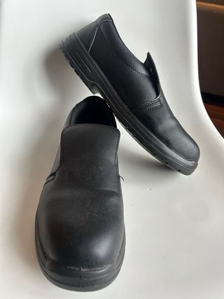 Zapatos de trabajo para cocina, con puntera de hierro. - Diseño clásico y cómodo. - Material sintético de fácil limpieza. - Suela antideslizante para mayor seguridad.