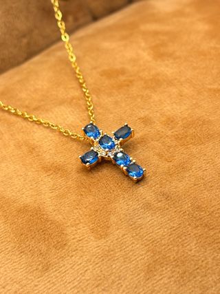 Elegante collar con colgante en forma de cruz adornado con circonitas azules y detalles en dorado. La cadena es de acero inoxidable. - Diseño de cruz con circonitas. - Cadena de acero inoxidable. - Largo de 40 + 5 cm No se pone feo, apto para pieles sensibles, ideal para el dia a dia o para regalar.