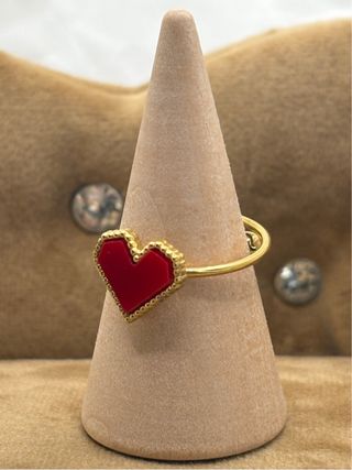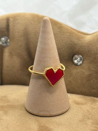 Anillo ajustable con un bonito diseño de corazón. - Corazón central de color rojo. - Aro dorado con detalles. - Material: Acero inoxidable. -Apto pieles sensibles. -Resistente al agua. Embalaje cuidado incluido detalle