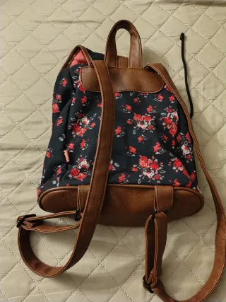 Mochila de la marca Lois con un diseño juvenil y práctico. - Estampado floral en tonos rojos sobre fondo negro. - Detalles en polipiel marrón. - Bolsillo frontal con cierre de botón. - Compartimento principal con cierre de cordón y solapa. - Correas ajustables.