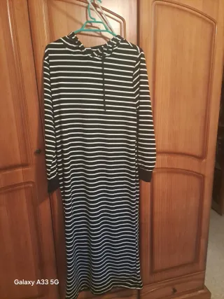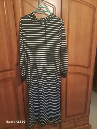 Vestido largo con estampado de rayas horizontales. Es un vestido tipo sudadera con capucha y cordones. - Mangas largas. - Largo hasta los tobillos. - Tejido elástico.