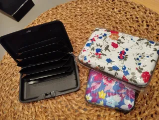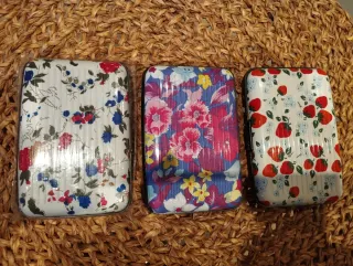 Tarjeteros con diseños alegres y coloridos. *A 1€ cada uno* - Un tarjetero con estampado floral blanco y azul. - Un tarjetero con flores rosas y amarillas sobre fondo azul. - Un tarjetero con estampado de fresas rojas sobre fondo blanco.