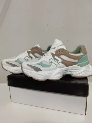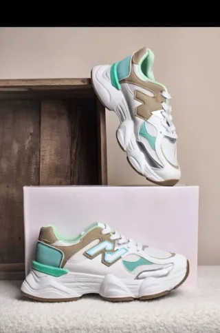 Zapatillas deportivas con un diseño moderno y suela cómoda. - Combinación de colores blanco, verde azulado y beige. - Detalles plateados. - Estilo deportivo y casual.