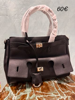 Elegante bolso negro con un diseño moderno y detalles metálicos. - Cierre principal con broche. - Bolsillos exteriores. - Asa de mano y correa ajustable. - Incluye correa adicional.