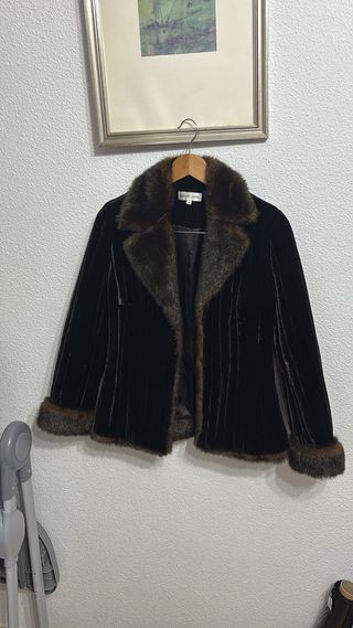 Elegante abrigo de la marca MARC DANIEL. - Diseño con cuello y puños de pelo sintético. - Confeccionado en terciopelo. - Color marrón oscuro.