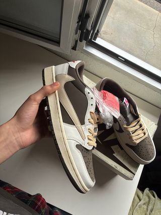 Zapatillas Nike Dunk x Travis Scott en tonos marrón y beige. Un diseño icónico para tu colección. - Combinación de colores marrón y beige. - Detalle de swoosh característico.