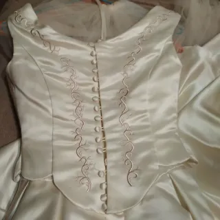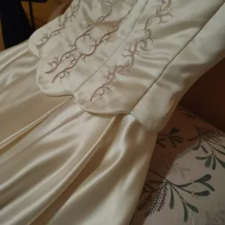 Elegante vestido de novia con detalles bordados. Vestido a medida por diseñadora importante colecciones de gala Vestido largo con cola. Vestido doble uso .solo vestido o con corpiño.Diseñado a medida por diseñadora. Tejido de alta calidad Satén y bordados a mano en corpiño Contacto wuassa y venta 630692724 Guadalajara España venta o Cabanillas del campo .consultar