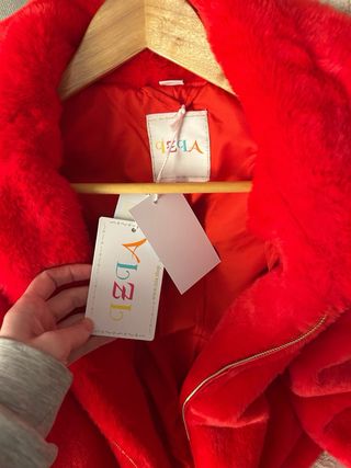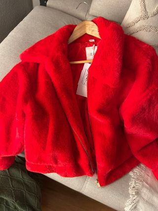 Chaqueta de pelo sintético en color rojo. - Diseño corto y moderno. - Cierre de cremallera. - Cuello amplio. Me la regalaron para reyes y me gusta pero sinceramente no se cuando me la voy a poner , su precio original son 107 euros