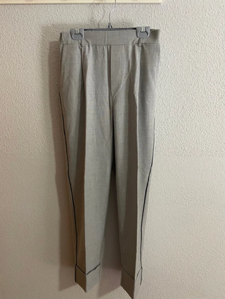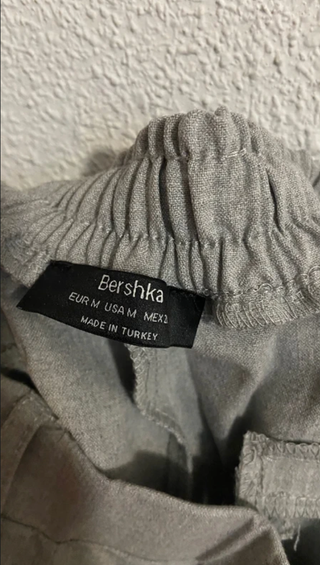 Pantalón de pinza gris de Bershka , con dos bolsillos laterales, dobladillo en la parte baja de cada pierna y dos diseños de bolsillo en la parte trasera (no son verdaderos), además de una línea negra en cada lateral y enganches para poder poner cinturón. No conserva la etiqueta pero nunca se ha utilizado.