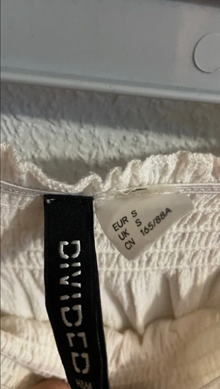 Top blanco de volantes con hombro descubierto de Bershka, talla XS.