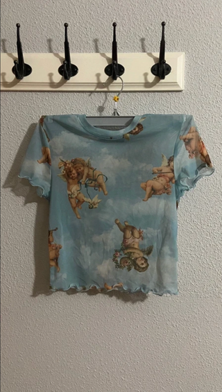 Top de transparencia azul con estampado de ángeles y nubes, talla XS. No conserva la etiqueta pero nunca se ha utilizado.
