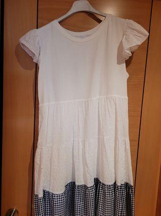 Precioso vestido de mujer. Es de color blanco y azul, con detalles de plumeti,calado, volantes,cuadro vicky - Diseño de tres niveles: superior liso, intermedio con calado y bajo a cuadros. - Mangas cortas con volantes. - Corte amplio y cómodo.