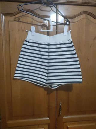 Shorts de la marca Keep&trendy, talla doble XS/S. Son de color blanco y negro a rayas. Están en buen estado y son ideales para el verano. - Diseño a rayas marineras. - Cintura elástica. - Bolsillos laterales.