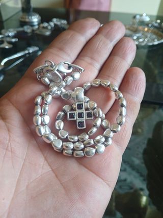 Colgante con diseño circular y detalles intrincados, unido a un cordón de cuero. - Diseño circular con motivos concéntricos. - Acabado en plata. - Cordón de cuero negro.