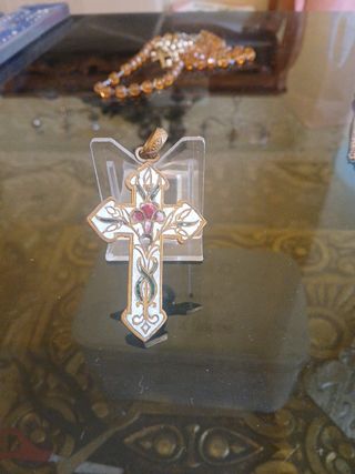 Preciosa cruz colgante con un diseño detallado y elegante. - Detalles en esmalte blanco y dorado. - Motivos florales y vegetales. - Inscripción 'INRI' en la parte superior.