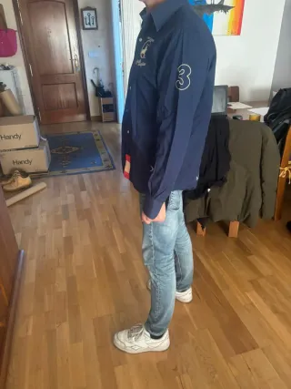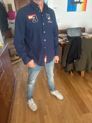 Camisa de manga larga de la marca Valecuatro en color azul marino. Presenta detalles bordados y un parche con el número 3. - Cuello tipo button-down. - Cierre de botones. - Parche con el número 3 en el pecho. - Detalle de bandera española en la solapa.