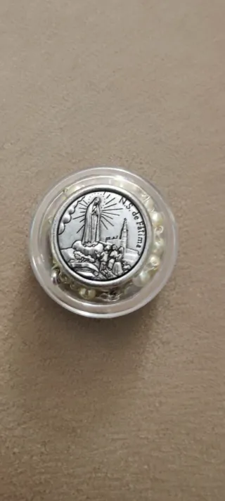 Rosario de Fátima con cuentas de color beige y detalles plateados. Incluye estuche. - Cuentas de aspecto perlado. - Medalla central con imagen religiosa. - Crucifijo detallado.
