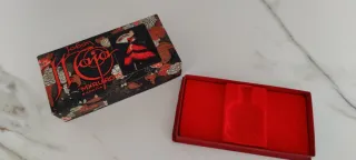 Caja vacia de jabón y colonia vintage de la marca Myrurgia, modelo La Maja. Presenta un diseño con una bailaora española. - Diseño floral en tonos rojos y dorados. - Imagen central de una mujer con abanico. - Texto ESPAÑA en la parte inferior.