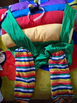 Disfraz divertido y colorido para adultos, perfecto para fiestas temáticas o Carnaval. Este disfraz de gusano está diseñado para ser cómodo y llamativo. - Diseño segmentado con múltiples colores vibrantes. - Incluye diadema con antenas. - Mangas y perneras a rayas. - Tejido suave y ligero.