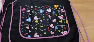 Estola o pichi de trabajo ideal para educadoras infantiles, maestras, monitoras, peluquerías o comercio.. Cuenta con un bolsillo frontal estampado con corazones de colores sobre fondo negro. - Ribete en color morado. - Lazos laterales para ajuste.