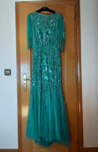 Elegante vestido de fiesta largo con un diseño de lentejuelas brillante. El vestido tiene un escote corazón y una silueta sirena que se abre en la parte inferior. - Diseño con lentejuelas. - Escote corazón. - Corte sirena.