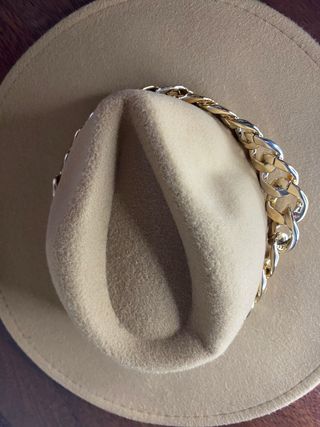 Elegante sombrero de fieltro en tono marrón, adornado con una llamativa cadena dorada. - Diseño moderno y sofisticado. - Cadena metálica de gran tamaño.