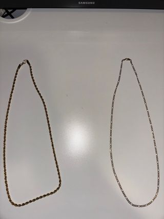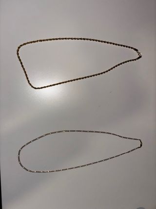 Dos cadenas con baño de oro, perfectas para complementar tu estilo. - Cadena estilo 'rope' (cuerda). - Cadena estilo 'figaro'. precio poco negociable