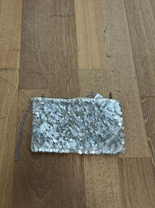 Elegante bolso de mano adornado con lentejuelas plateadas. Perfecto para complementar tu atuendo. - Diseño con lentejuelas brillantes. - Incluye una cadena metálica. - Cierre de cremallera.
