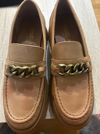 Mocasines de piel de la marca Carmela, con un diseño elegante y moderno. - Piel de alta calidad. - Detalle de cadena dorada en la pala. - Suela gruesa y cómoda.