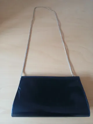 Elegante bolso de mano con un diseño brillante y moderno. Perfecto para complementar tu atuendo. - Acabado metálico. - Cierre con broche. - Incluye cadena fina para llevar al hombro.