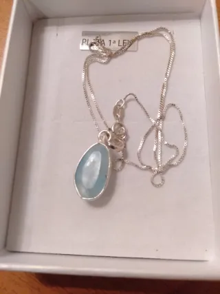 Elegante conjunto de colgante con piedra larimar y cadena. - Colgante con forma ovalada. - Piedra larimar de tonos azules y blancos. - Cadena de plata con eslabones tipo caja. Hace 44 cm