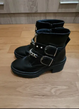 Botines negros con detalles metálicos y cadena. - Diseño moderno y versátil. - Cierre de cremallera lateral. - Tira decorativa con cadena. - Material sintético.