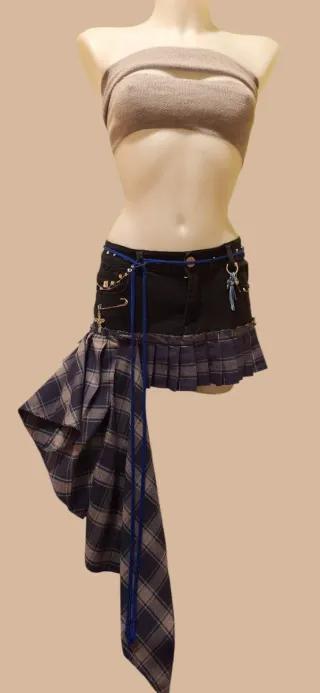 Minifalda de estilo punk con un diseño atrevido y detalles únicos. - Diseño asimétrico con volantes. - Adornada con cadena y detalles metálicos. - Cintura con trabillas para cinturón.