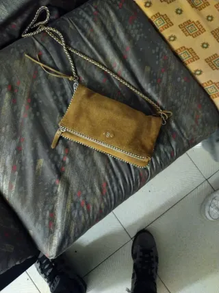 Bolso de mano o de hombro en color marrón, con un diseño moderno y elegante. - Material: Ante. - Cierre de cremallera. - Detalle de tachuelas plateadas en los bordes. - Correa de cadena plateada. - Pequeño detalle de iniciales B en la parte frontal.