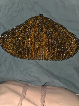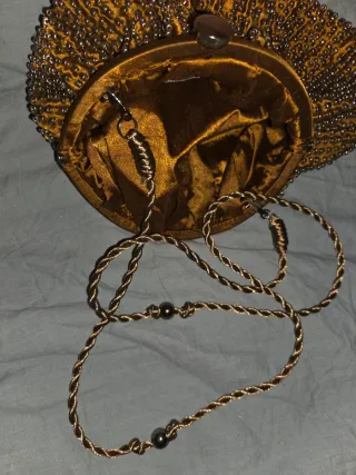 Elegante bolso de mano con un diseño adornado y una cadena para llevarlo. - Acabado en tono dorado. - Detalle de cuentas y pedrería. - Cierre de broche metálico. - Cadena trenzada para colgar.