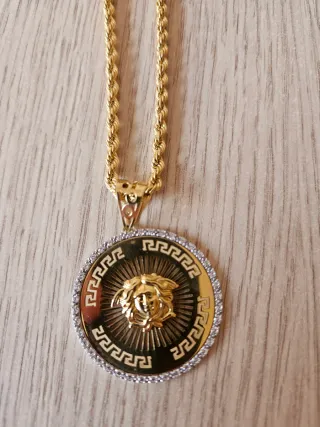 Elegante cadena de oro de 18 quilates con un colgante inspirado en el diseño de Versace. La medalla presenta el icónico rostro de Medusa rodeado por un borde decorativo y detalles brillantes. - Cadena de oro 18k. - Colgante con diseño de Medusa. - Borde con circonitas. Escucho ofertas