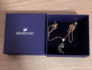 Elegante colgante con forma de luna y detalles en negro y un pequeño cristal. - Cadena fina color oro rosa. - Cierre de mosquetón. - Colgante con diseño de luna. - Pequeña perla y cristal. - Color oro rosa y cristales azules