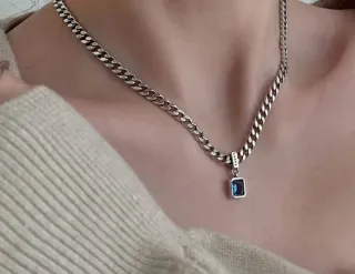 Elegante cadena con un colgante de zafiro azul. - Baño de oro blanco. - Diseño de cadena cubana.
