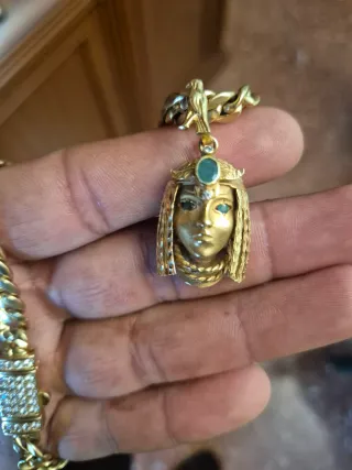 Elegante conjunto de cadena y colgante. - Fabricado en oro de 18 quilates. - Peso total de 38 gramos. - Diseño con colgante de cabeza egipcia y detalles en esmeralda.