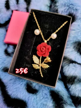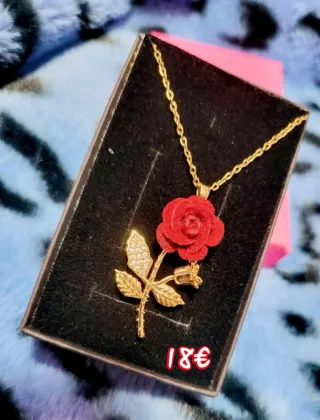 Elegante collar con un colgante de rosa roja y una hoja dorada adornada con pequeñas circonitas. La cadena es fina y dorada, perfecta para complementar cualquier atuendo. - Diseño de rosa roja. - Colgante de hoja dorada con circonitas. - Cadena dorada.